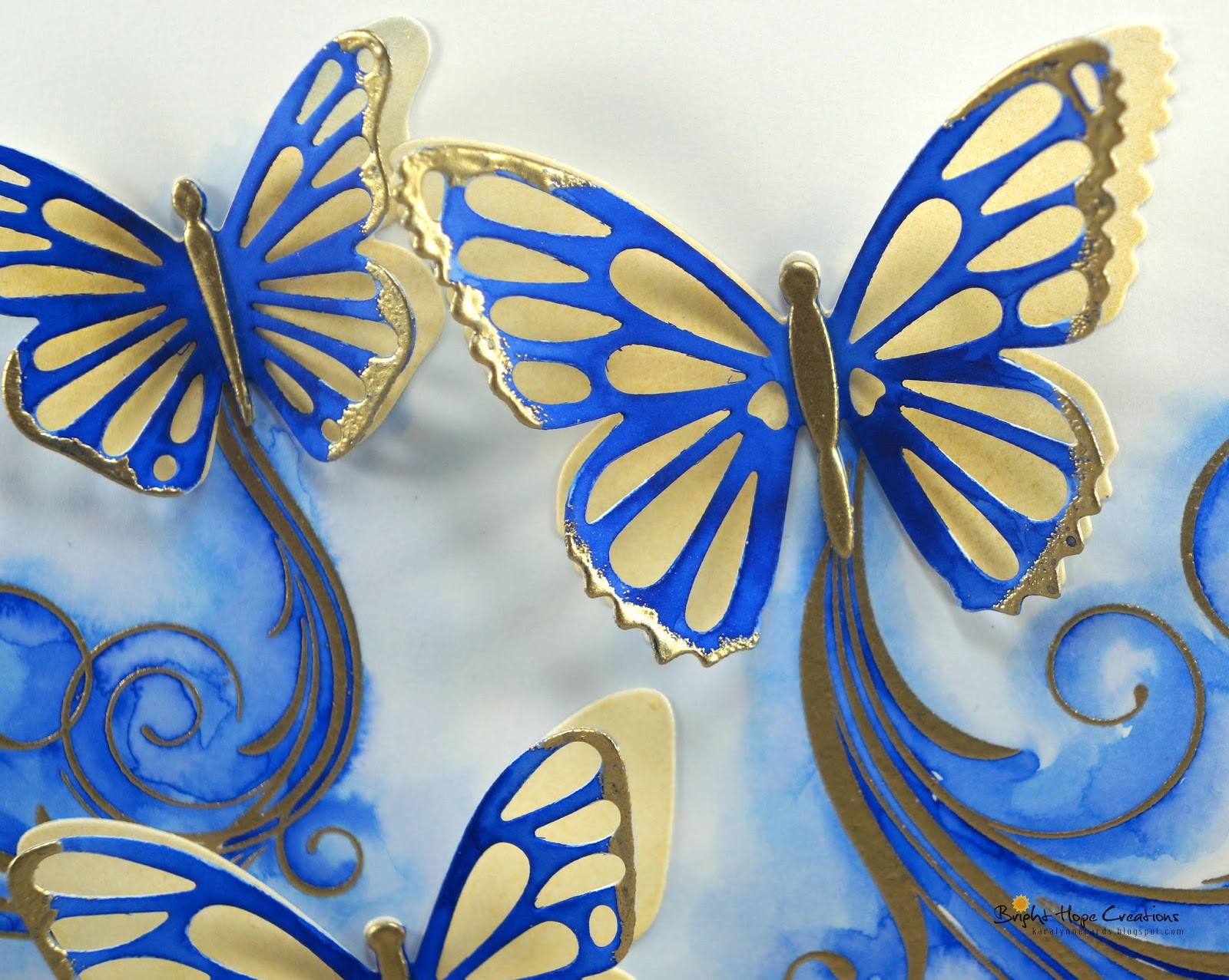 The blue/gold card was fun to create. I painted along the heat embossed swirls with a blue Zig CCRB pen. The solid portion of the butterflies was inked in gold and the lace portion was partially embossed and watercolored with the same blue marker. The white sentiment on the bottom balances the white at the top.