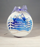 Oh, so much to love here!  Loll's background reminds me of the Northern Lights, and those white trees and glittered snow are so striking!  I was drawn to creating a scene and followed closely with white glittered trees.  My pop of inky color took the form of mountains.  My purple organza bow follows along with Loll's gorgeous full white one.