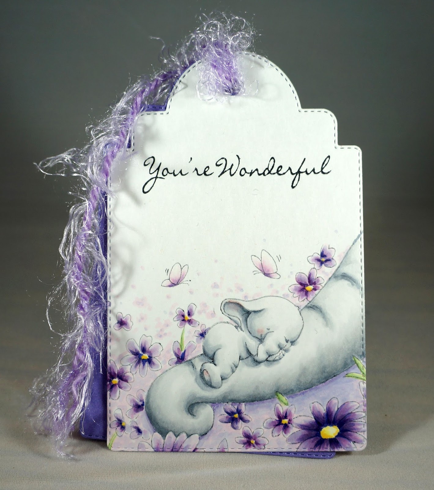 I love the way Rubeena stamped the image off the edge, so I chose an image that would have a similar appearance.  I got out my Zig Clean Color Markers and went to work coloring away to achieve a watercolor effect just like Rubeena.  What, you don't see gorgeous watercoloring?  No, you're right, I scrapped that monstrosity (and by scrapping, I mean in the bin, not the family scrapbook).  I then pulled out the Copics.  Ahh, peace in the craft room.  To continue with Rubeena's look, I added a simple, one-line sentiment, shimmery cardstock as a second tag and finished off with something textural for the tie.