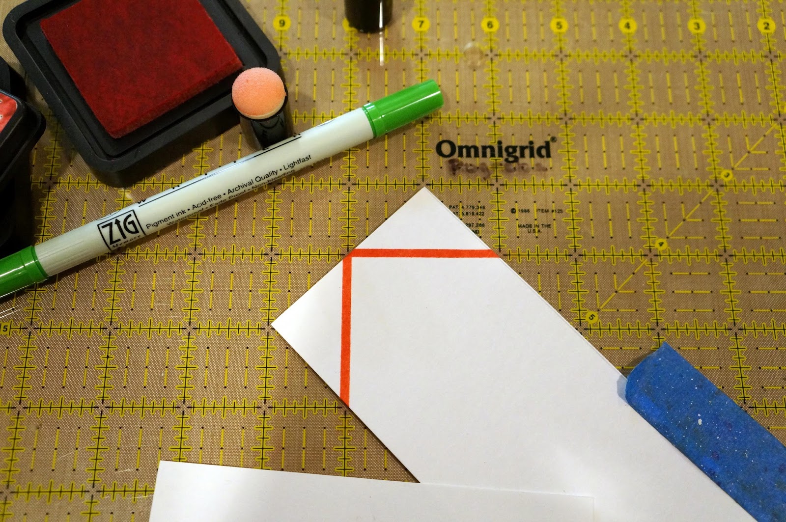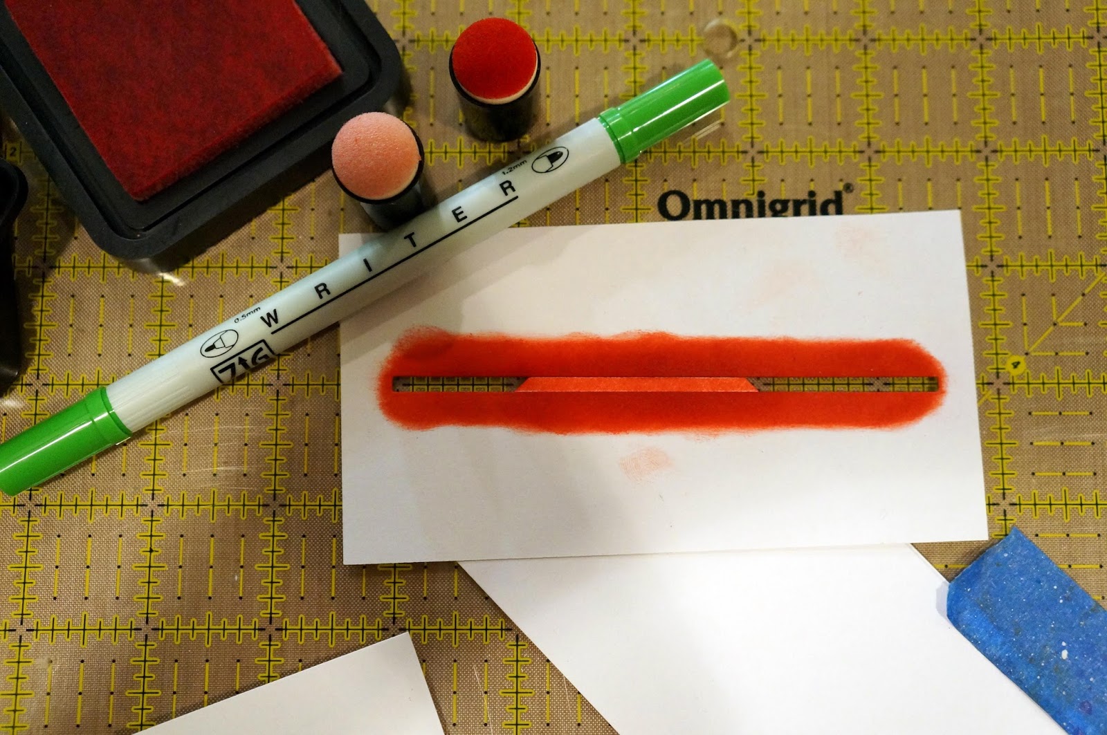 3)  Since I just used regular weight cardstock to create my stencil, I learned that I needed to change out the stencil once it became too saturated with ink.  You can see on one of the red stripes below that it was time to change the stencil!  The line did not stay crisp (not a bad look, though, for another project).