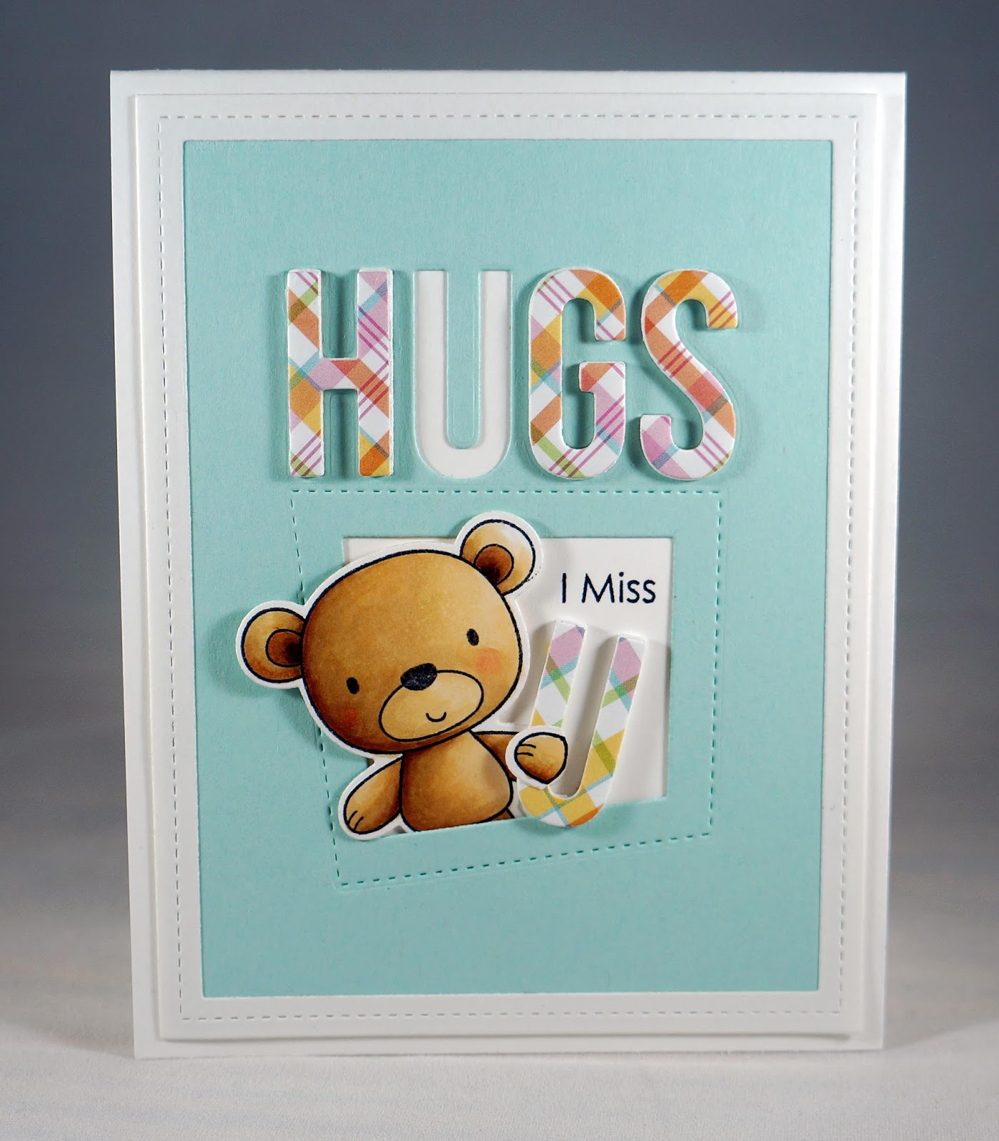 This adorable little guy pops out perfectly out of his Peek-a-Boo Wonky Window, with the partial sentiment, "I Miss" just above the "U" missing from the Hugs word above.  The bear was colored with Copics.  I stamped and colored an extra right paw so he could look like he's holding the "U". The "Hugs" die word was cut three times, once in plaid, once in foam, and once in the blue cardstock.  The scene was then framed with a Single Stitch Line Rectangle Frame border in white and mounted on a white top folding notecard.  All of the supplies are listed below.