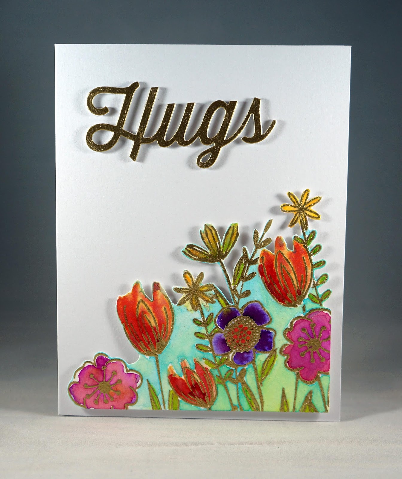 Moving in an entirely different direction, the next two cards feature the script Hugs Die-namics, and the Sketched Blooms 2 stamp set.