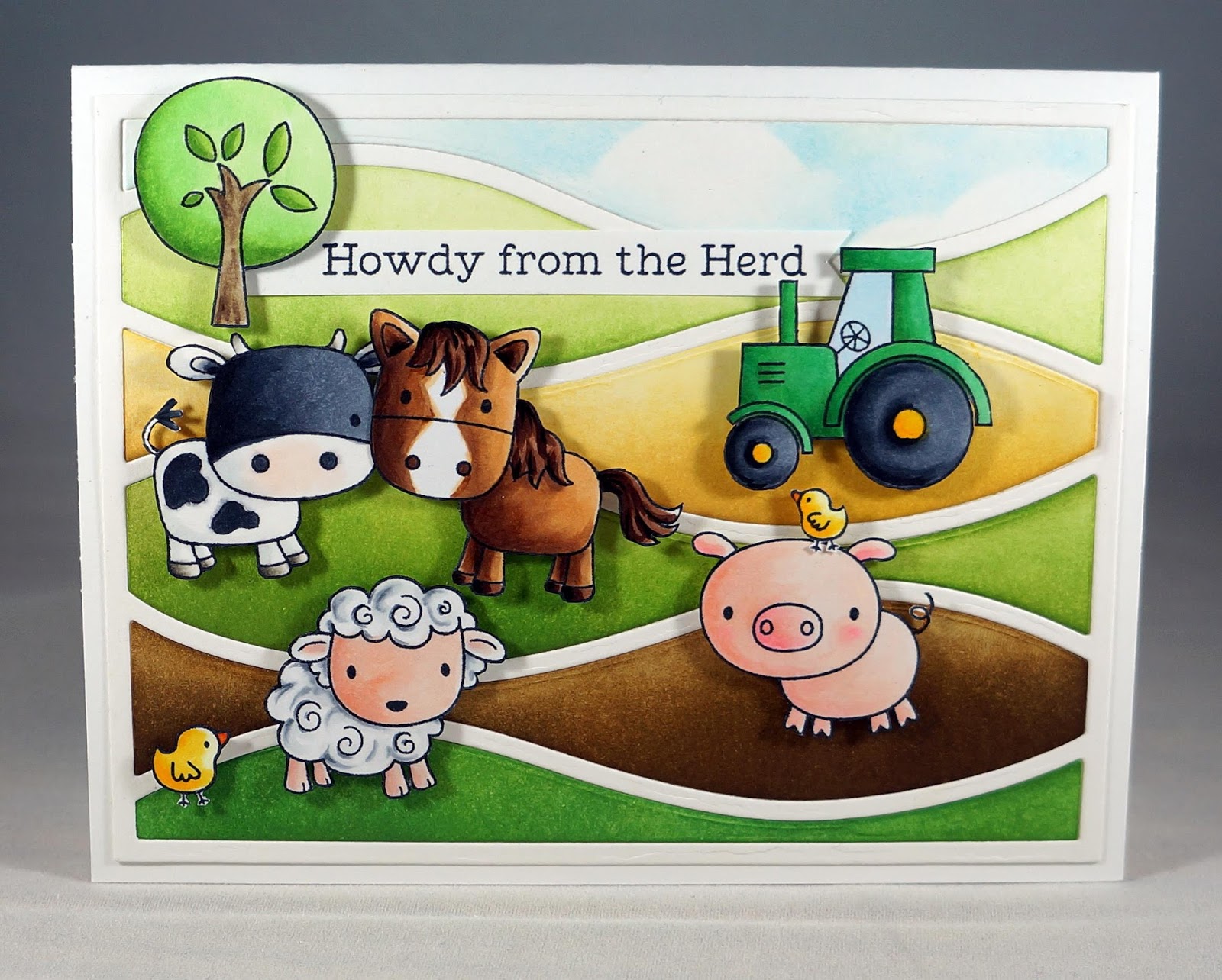 My first card features those sweet little animals from Farm Friends.  They were all colored with Copics and fussy cut.  The background was created using the Horizontal Snow Drifts Cover-Up.  I ink blended each inside section with Distress Ink going from darker in the foreground, to lighter in the background.  I made a stencil using the Stitched Cloud Edges and blended Distress Ink with a finger dauber for the sky.  Each of the animals was popped up with foam tape for dimension.  At first I put the littlest chick on top of the tractor, but moved him onto the pig when I realized, in perspective, that would be one very giant chicken!  I stamped the sentiment from the same stamp set on white cardstock, and cut it into a banner coming out from the tree.