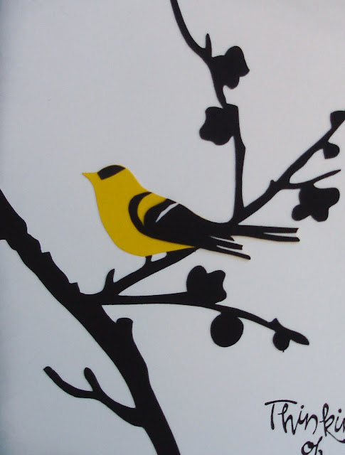 I used a digital cut on my Silhouette called "bird on branch". I cut it in black and then partially yellow. In order to make it into a goldfinch, I free hand cut the black cap and wing, snipped the wing in places and put white paper partially under it so the white and yellow would show through. I sent it all through the Xyron 5" sticker maker. The sentiment is from Stampin' Up, inked with Brilliance Graphite Black and I used Black Soot Distress ink on the edges.