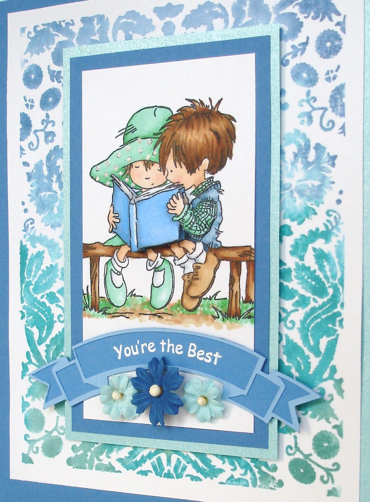 Times to Treasure. colored with Copics. I cut out the book along with the hands and the boy's sleeve to give it some dimension. I just noticed from this angle he looks like he has two left hands!!! Hard to see here, but I scored the book on both sides of the binding to help shape it. The Hero Arts stamp is